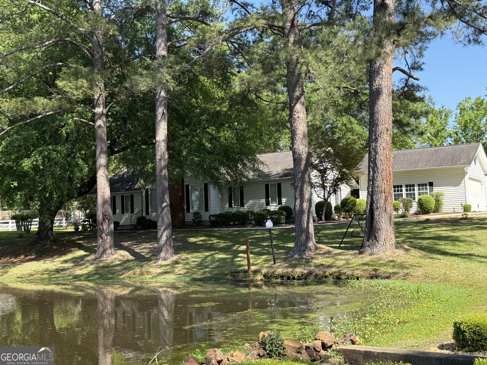 Talk about curb appeal! Front view of this beautifully landscaped home is a half acre pond that is shared with one neighbor. Relax in the swing by the pond or enjoy fishing on your own property. Yet you are only minutes away from shopping, restaurants, schools and more! This 3 bedroom 2 bath home has a large living area with gas log fireplace and is open to the kitchen and dining. Kitchen comes with all appliances and has lots of cabinetry. Dining area has surrounding windows great for the natural light as well as the views of this gorgeous property. Master bedroom has huge walk in closet with built in organization shelves. Spacious master bath offers two vanities with tub/shower combo. Split bedroom plan with 2 additional bedrooms and hall bath. Outside you have lifetime back decking, and a covered breezeway to a detached two car garage. Additionally, the property has a 20x20 shop, irrigation system that is on a private well, and vinyl fencing.